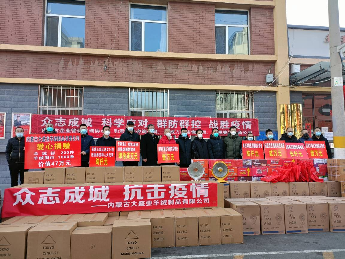 6、副會(huì)長(zhǎng)單位-內(nèi)蒙古大盛業(yè)羊絨制品有限公司:2月21日,將價(jià)值47萬(wàn)元的200件羊絨衫、1000條羊絨圍巾捐贈(zèng)給玉泉區(qū)紅十字會(huì),為抗疫人員送去溫暖。